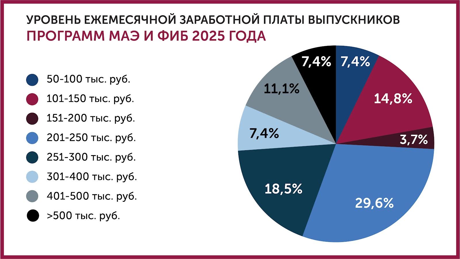 Согласно проведенному Центром развития карьеры и лидерства РЭШ (ЦРКЛ) исследованию, среднемесячный доход молодых специалистов-выпускников дневных программ РЭШ 2025 года, включая МАЭ, ФИБ, МНФ и БАЭ, составляет 252,9 тыс. рублей. При этом около 30% выпускников программ «Магистр экономики» и «Финансы, инвестиции, банки» получают от 201 до 250 тыс. рублей в месяц, 18,5% — от 251 до 300 тыс. рублей в месяц, 11% — от 401 до 500 тыс. рублей в месяц и еще 7,4% — более 501 тыс. рублей в месяц.