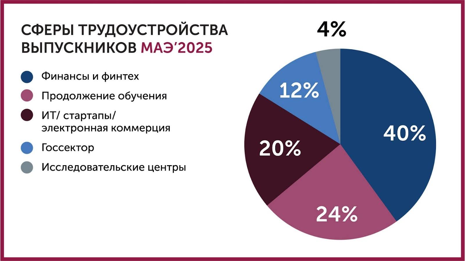В 2025 году программу МАЭ окончили 33 студента. 40% из них нашли свое место в сфере финансов и финтех направлении, 20% выбрали карьеру в ИТ и e-commerce (электронная коммерция), 12% предпочли государственный сектор, а еще 4% продолжили профессиональное развитие в научно-исследовательских центрах. Таким образом, по сравнению с прошлым годом наблюдается сохранение устойчивого спроса на выпускников программы в финансовой и технологической отраслях, а также значительный рост числа выпускников, выбравших государственный сектор.