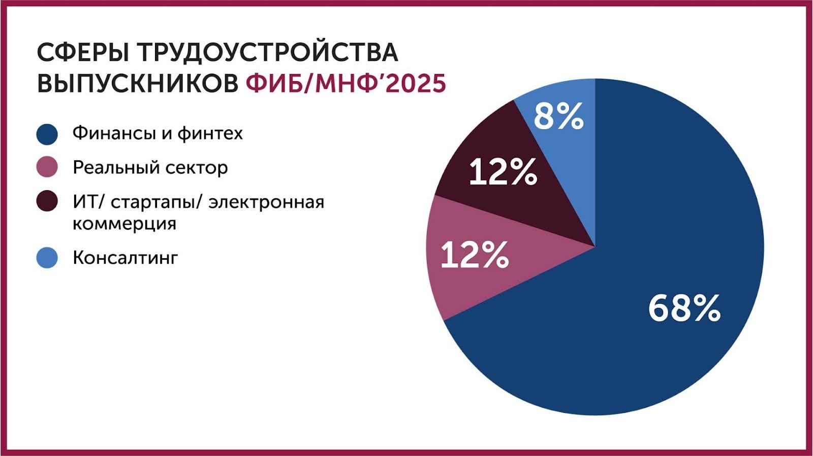 В 2025 году 68% всех выпускников программ ФИБ и МНФ выбрали карьеру в финансах, 12% — в сфере ИТ, 12% развиваются в реальном секторе, стартапах и электронной коммерции, еще 8% — в консалтинге. По сравнению с прошлым годом прослеживается рост интереса к сфере финансов (+8% по сравнению с 2024 годом) и снижение — к консалтингу (-12% по сравнению с 2024 годом). Карьеру в госсекторе в 2025 году не выбрал никто из опрошенных выпускников программ ФИБ и МНФ.