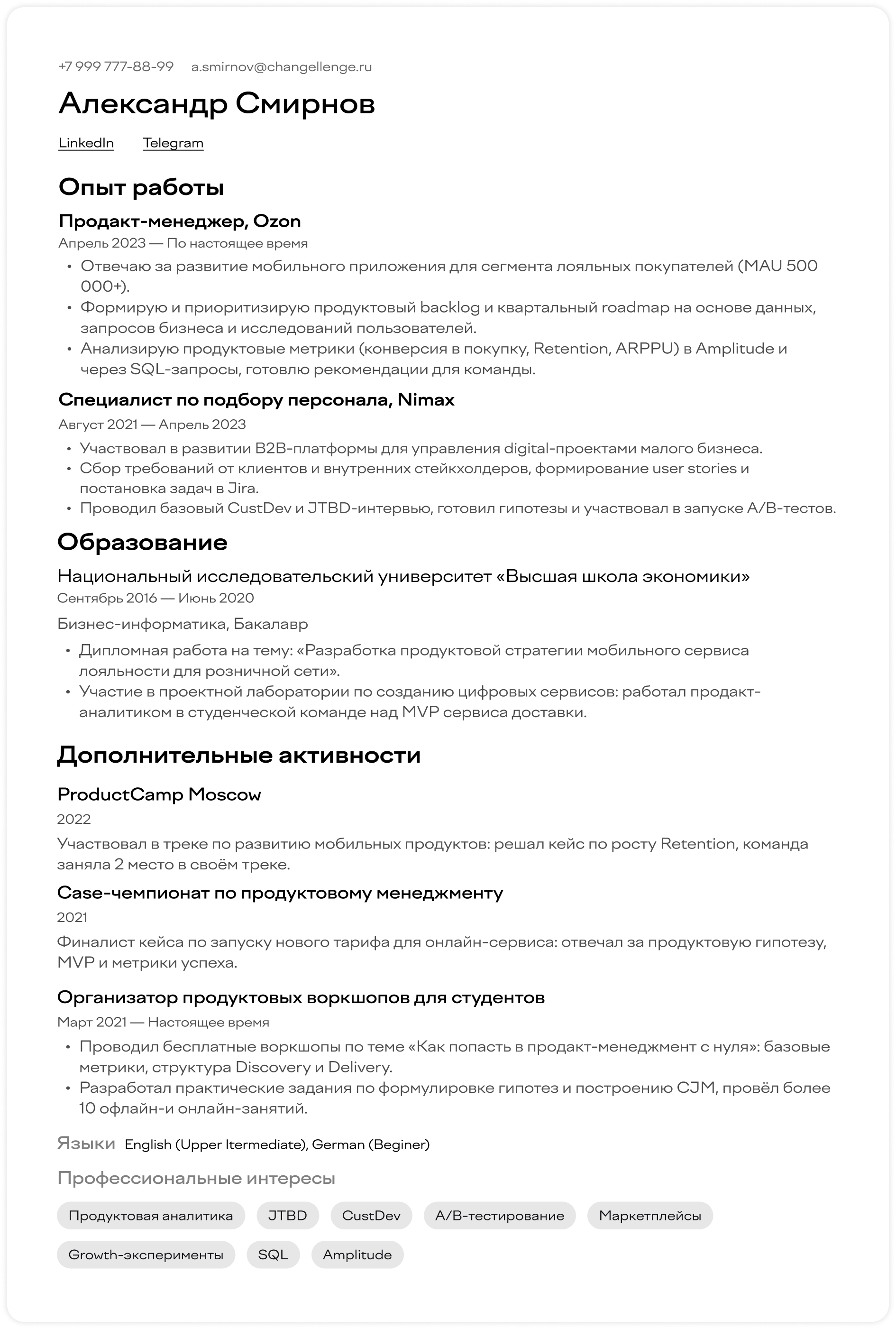 Иванов Андрей Сергеевич Продакт-менеджерТелефон: +7 999 123-45-67 Email: andrey.ivanov.pm@gmail.com Telegram: @andrey_product LinkedIn: linkedin.com/in/andrey-product На связи по будням с 10:00 до 18:00 по МСК