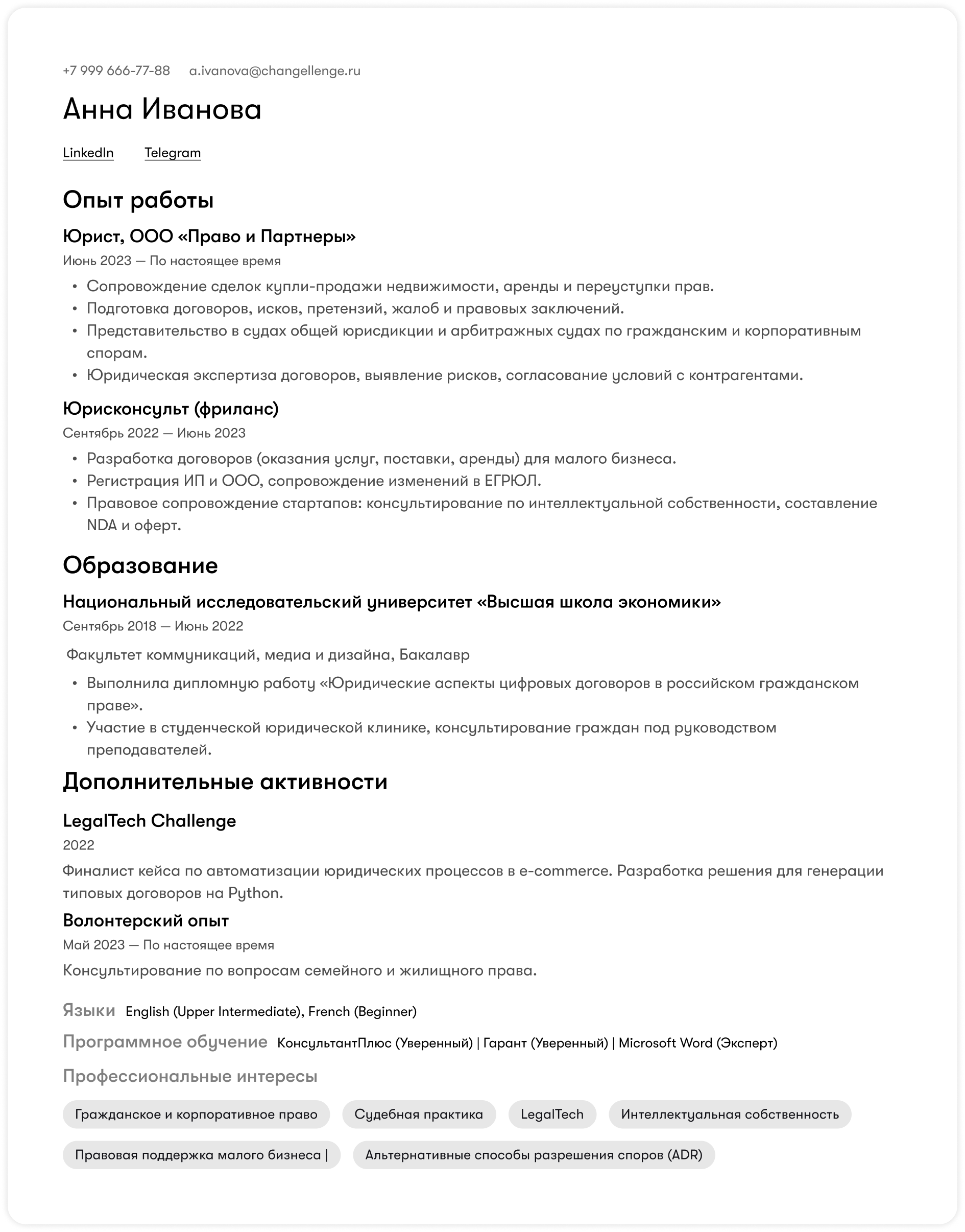 Если вы ведёте профессиональный блог, публиковались на юридических платформах или у вас есть профиль в LinkedIn — обязательно добавьте ссылку. Это покажет вашу активность, погружённость в профессию и интерес к саморазвитию.