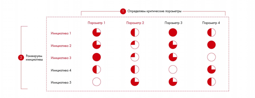 Другой инструмент, который поможет выделить самые важные гипотезы, — это так называемые шары Harvey’s Balls. Они позволяют быстро провести качественный анализ и сравнить несколько альтернатив по ряду параметров. Для этого нужно создать таблицу, где в заголовках столбцов будут критерии, а в первой строке — гипотезы. На пересечении нужно изобразить круговые диаграммы, в каждой из которых закрашено от нуля до четырех секторов. Пустой круг означает полное несоответствие критерию, а заполненный — полное соответствие. Шары Harvey’s Balls пригождаются, когда нужно сравнить несколько альтернатив, но при этом точная числовая оценка не нужна или не все критерии можно измерить количественно, но нужно сравнить несколько инициатив.