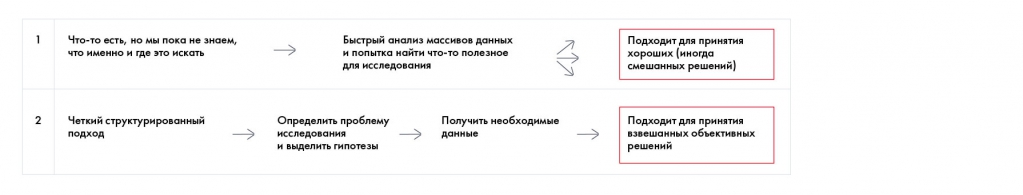 Третий шаг — сбор данных и анализ гипотез. Именно здесь начинается активная работа с информацией. На этом этапе у вас есть список гипотез, которые вы проверяете с помощью тех или иных данных. Если при неструктурированном подходе вы ищете информацию наугад и изучаете все, что попадется, то здесь у вас есть план действий и конкретные запросы. Видите разницу? Вы не распыляетесь, а ищете только то, что нужно для решения.