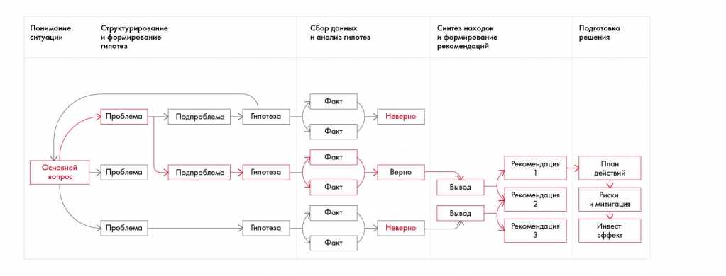 Гораздо полезнее второй способ, который используют консалтинговые компании: McKinsey & Company, BCG, Bain & Company, Strategy Partners Group, Oliver Wyman, A. T. Kearney, Accenture и другие. Это четкий и структурированный подход: сначала определяется проблема, затем она делится на части и прорабатывается по каждому направлению с использованием нужных данных. Этот способ дает взвешенные и объективные решения.